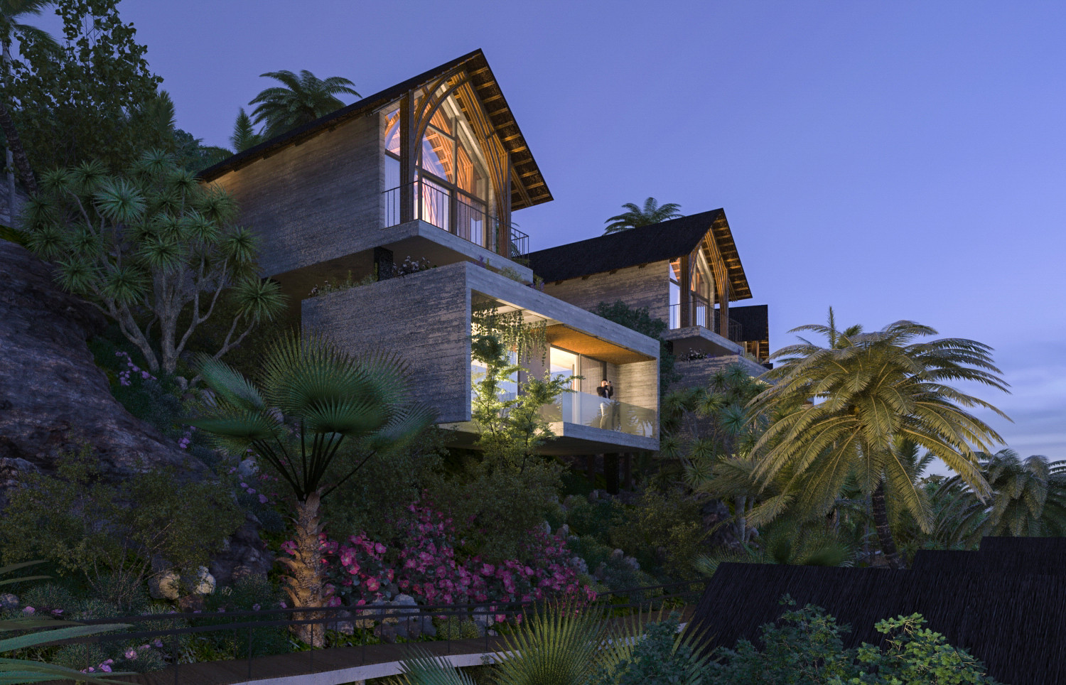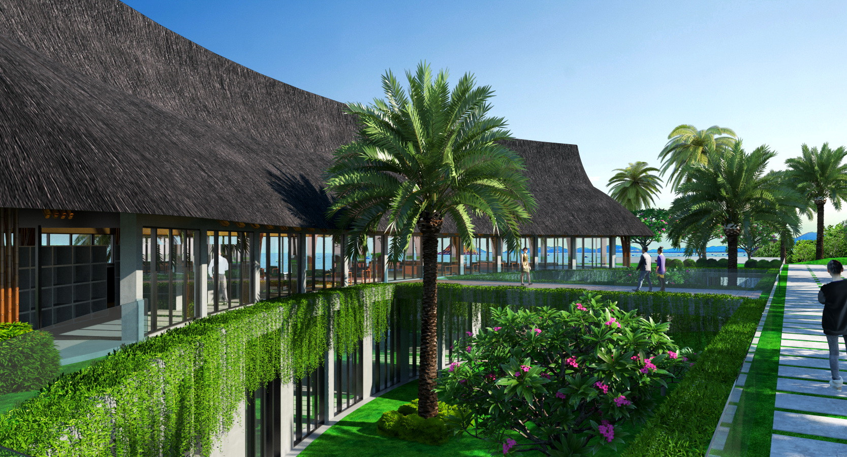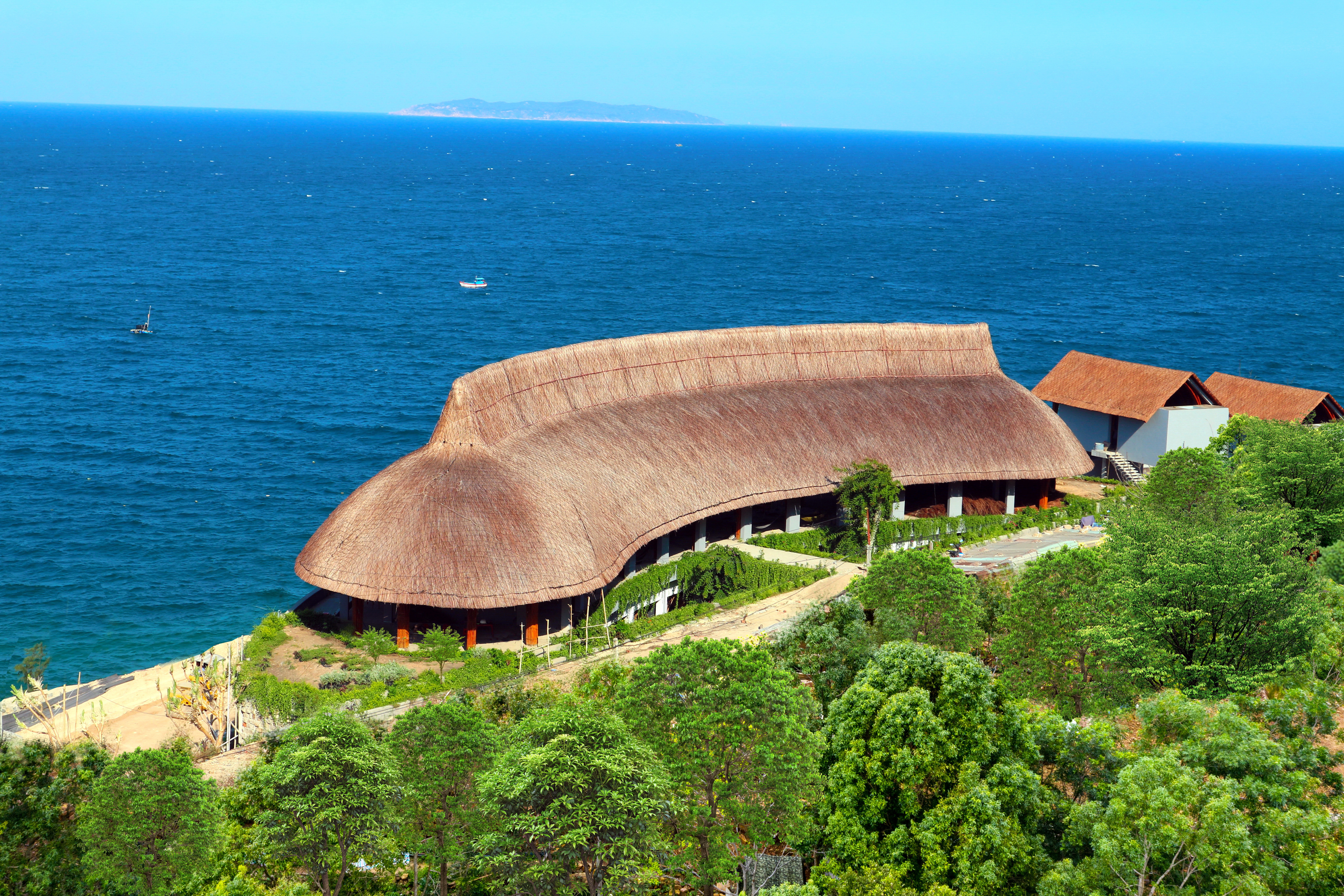 Các mái lợp được làm từ lá dừa hoặc lá cọ, tạo nên vẻ đẹp tự nhiên và phù hợp với khí hậu nhiệt đới, đồng thời giúp giảm sự tích tụ nhiệt và duy trì không gian trong mát.