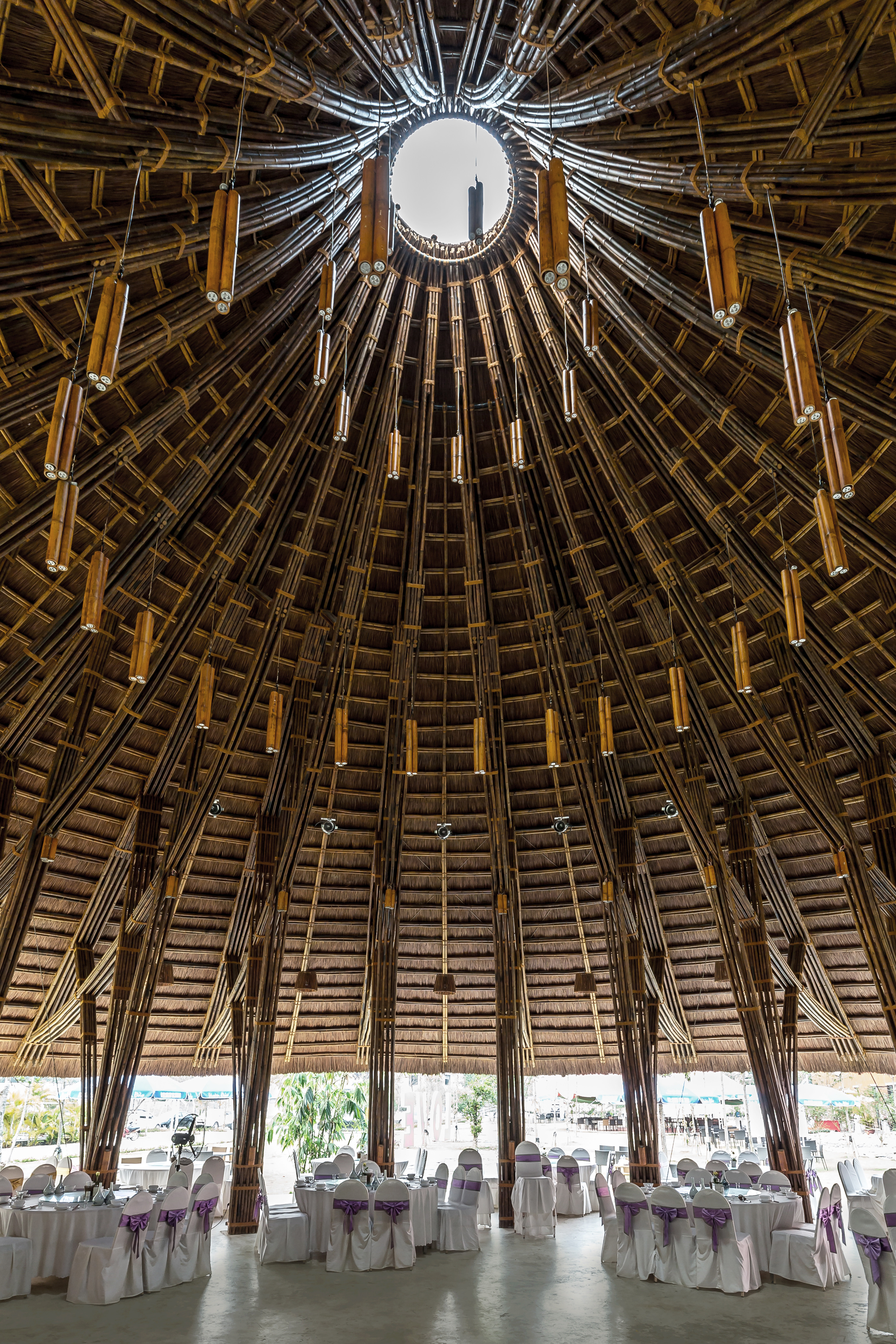 Kết cấu chính của công trình sử dụng tre tầm vông, một loại tre cứng có khả năng chịu lực cao, còn được gọi là tre sắt. Loại tre này được trồng tự nhiên hoặc trồng ở các tỉnh phía Nam như Tây Ninh, Bình Dương, Bình Phước, với chiều dài tự nhiên lên đến 12 mét. Tuy nhiên, chỉ khoảng 6,5 mét tre có thể sử dụng cho mục đích xây dựng, với đường kính từ 30-50mm, giúp tre dễ uốn cong và dễ dàng chế tạo các chi tiết cấu trúc.