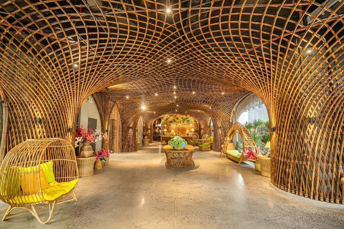 Vách kính lớn và các cửa sổ rộng không chỉ tối ưu hóa ánh sáng tự nhiên mà còn giúp tạo sự kết nối tuyệt vời giữa không gian trong nhà và ngoài trời. Mái vòm tre lớn bao phủ toàn bộ không gian lễ tân, tạo sự mát mẻ và thoải mái cho du khách ngay khi bước vào khách sạn.