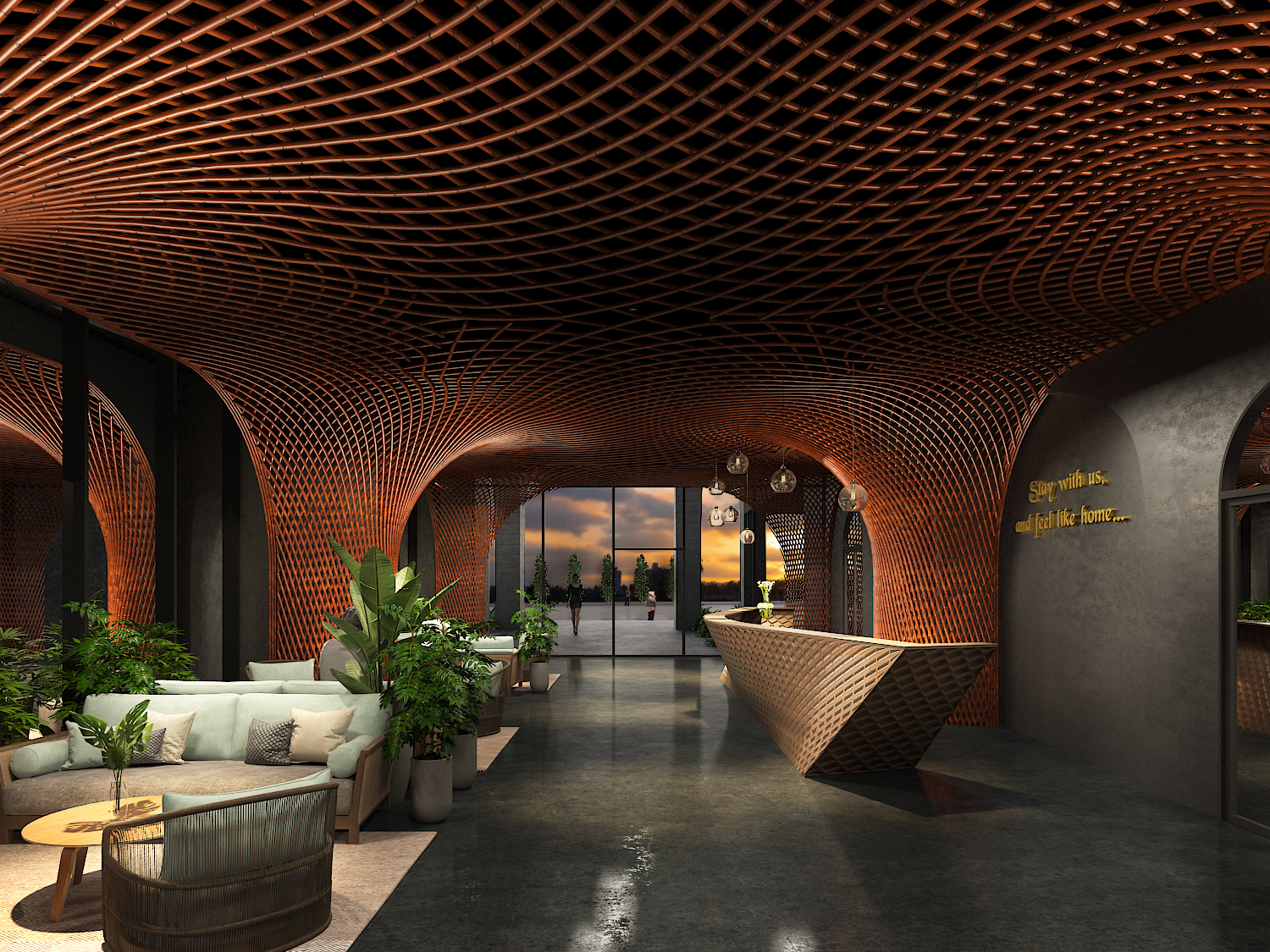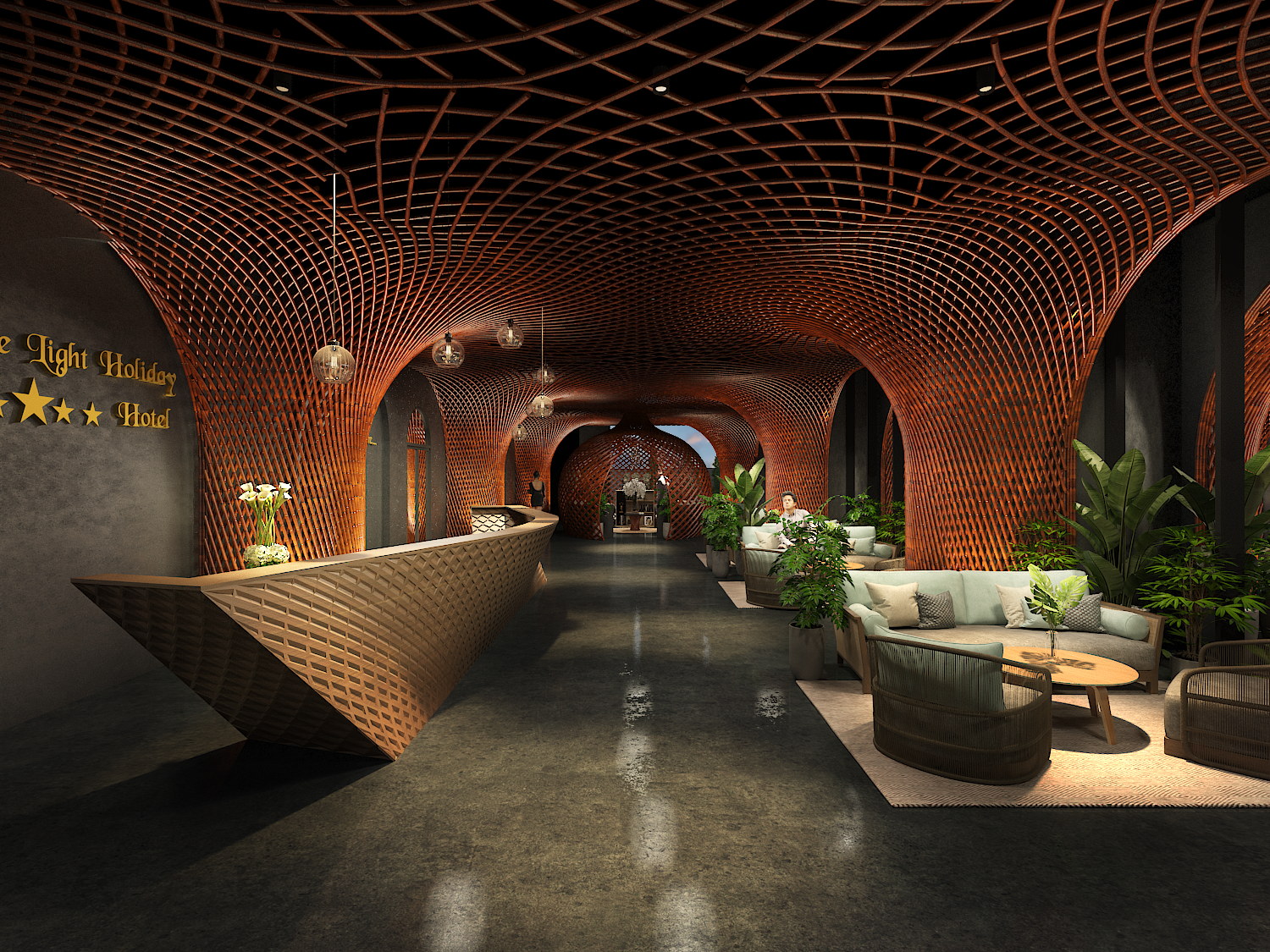 The Signature Hotel Nha Trang Lobby được thiết kế với không gian mở, giúp tối ưu hóa việc sử dụng ánh sáng tự nhiên và tạo cảm giác rộng rãi, thoáng đãng. Công trình sử dụng các mái vòm tre và vách kính lớn, giúp không gian trở nên sáng sủa và dễ tiếp cận, đồng thời tạo liên kết chặt chẽ với cảnh quan xung quanh.